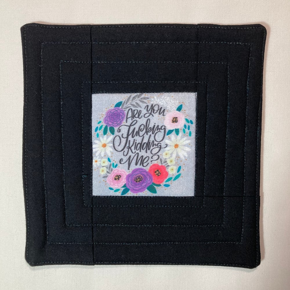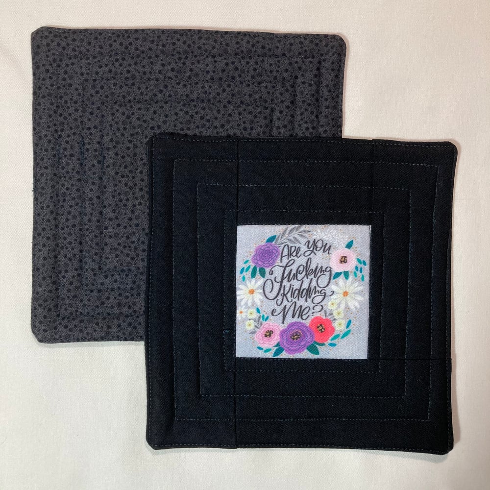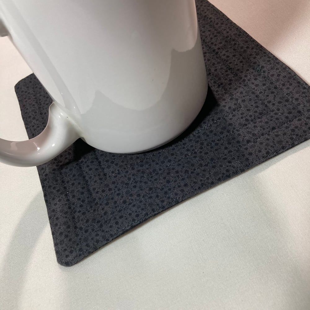 Reversible. Oversized quilted coaster measures approximately 6" square.